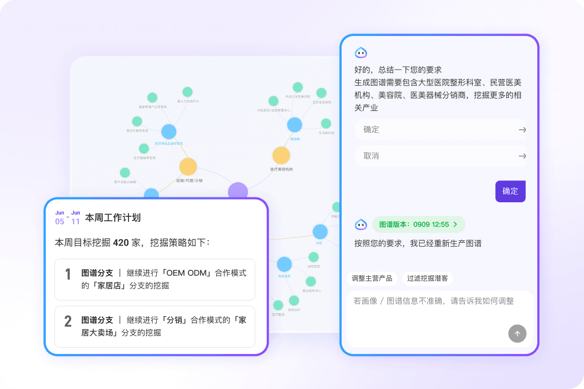 支持通过对话功能进行日常操作,如修改图谱、修改公司简介、调整营销策略等
