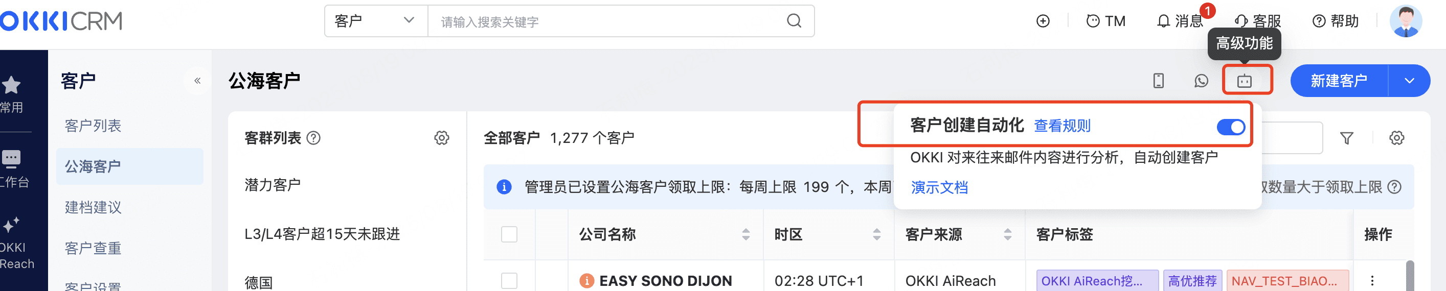 同时需要保证客户自动化-AiReach创建开启