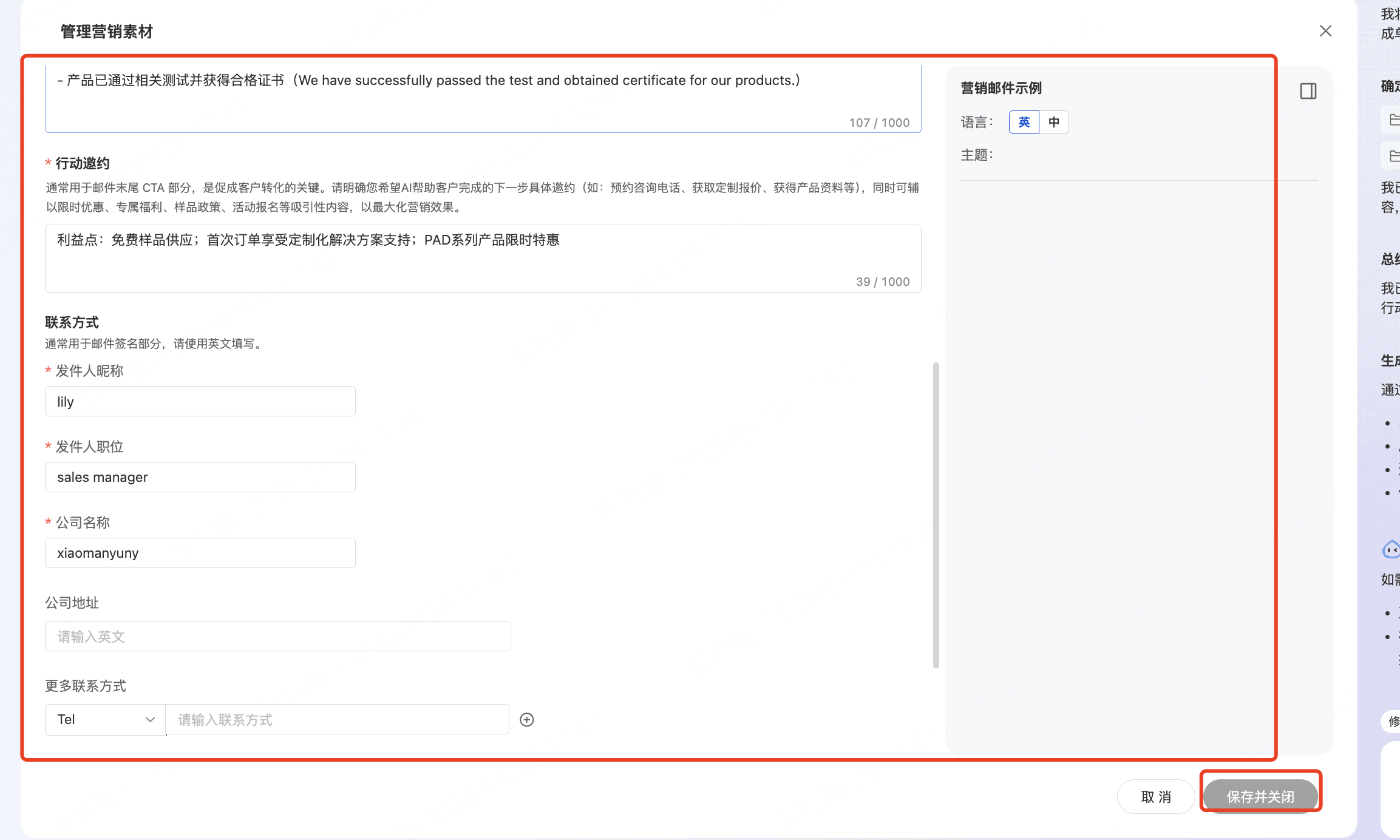 AiReach 会基于公司画像部分所填写的公司官网、阿里国际站官网等从多个维度总结为可用于营销的内容,后续在写邮件的时候,会引用素材库进行邮件内容的生成,因此商家需要提前设置营销素材库信息(产品介绍,签名联系方式地址等信息),AiReach会基于设置的素材库进行生成邮件内容