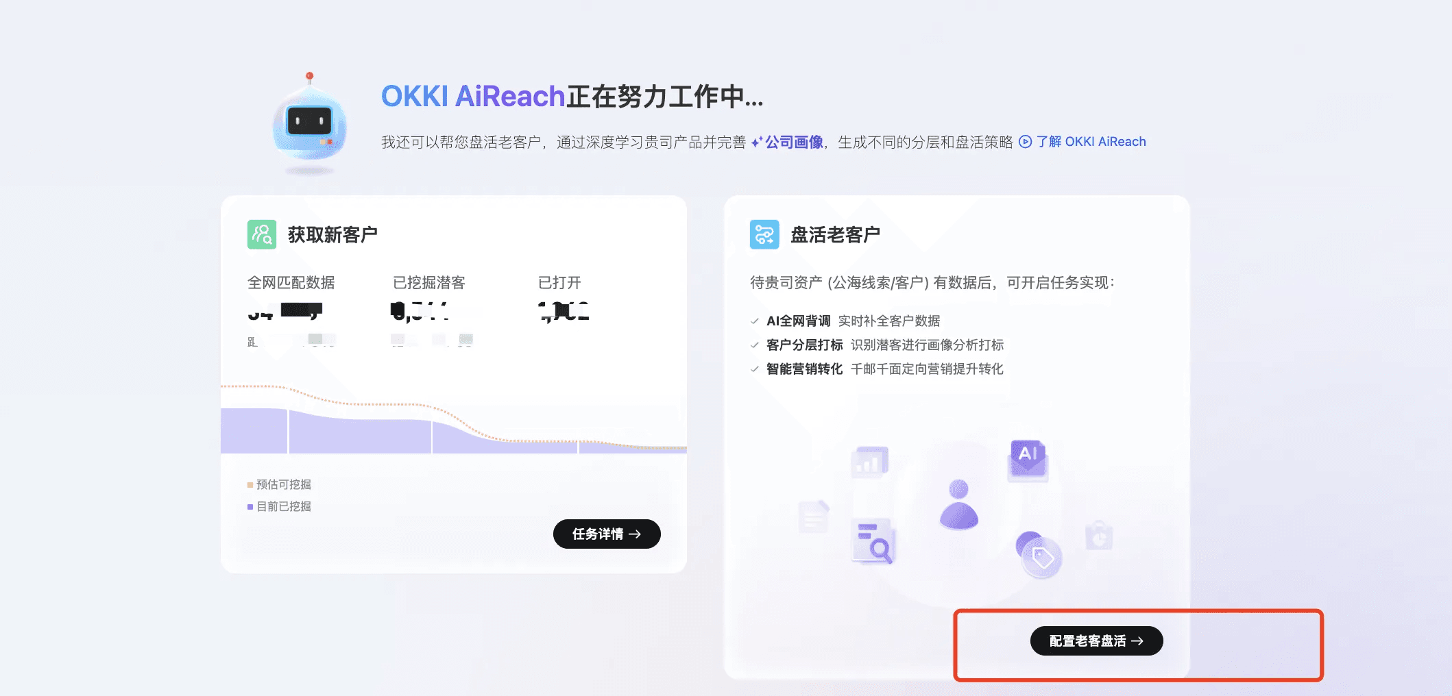 让AiReach开启获取新客/盘活老客的任务(根据公司业务场景开启,也可以开启2个任务)-点击设置开启任务