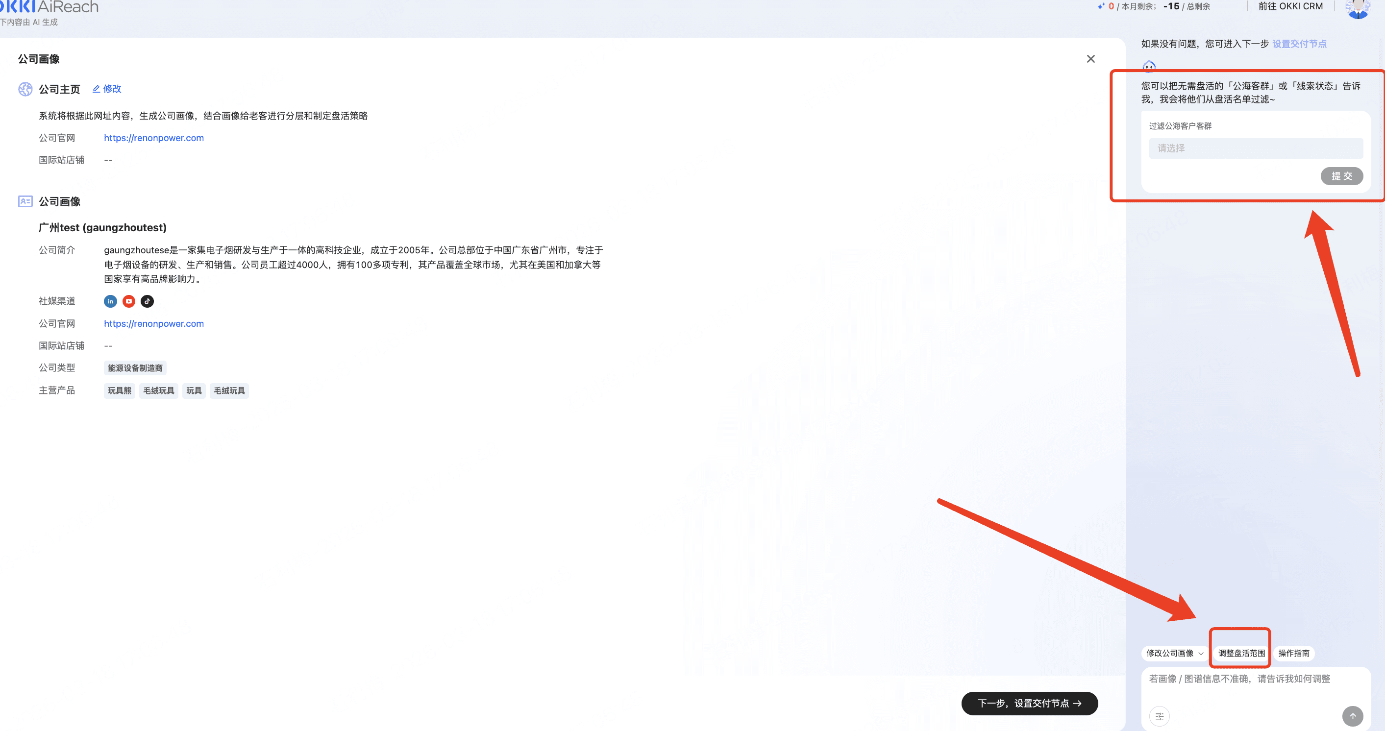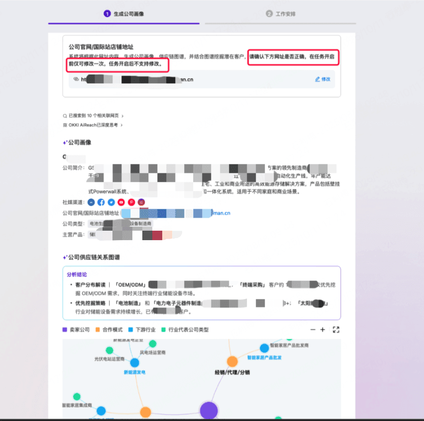 开启新客挖掘场景:OKKI AiReach会根据公司信息生成公司画像和供应链图谱,助力精准新客挖掘,请检查「公司画像/供应链图谱」是否准确,如不准确可通过修改下方「网址」来重新生成