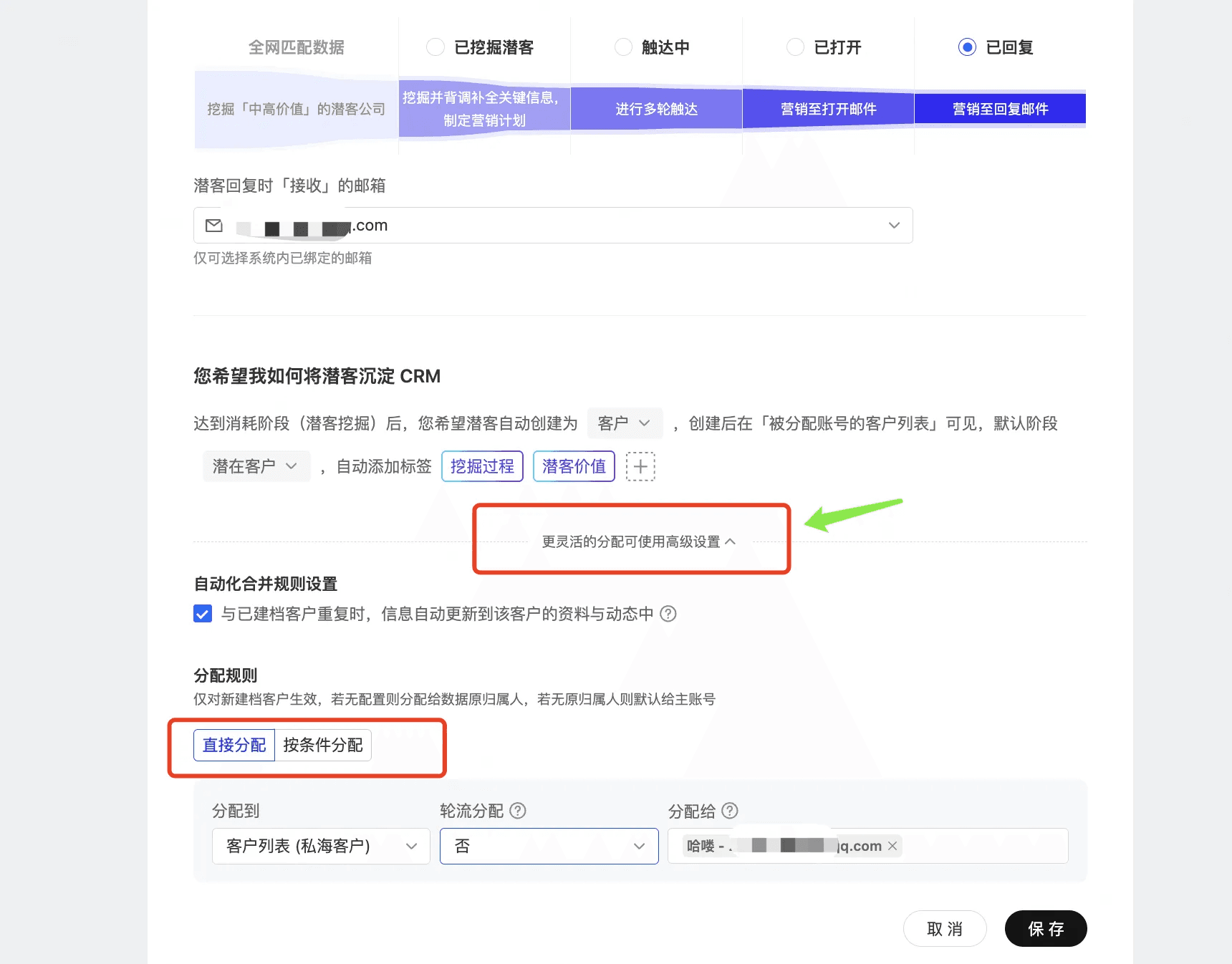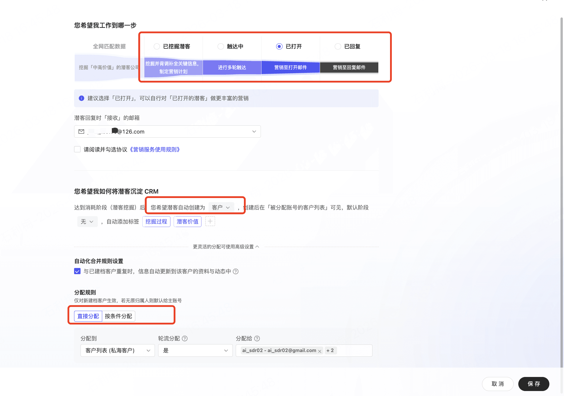 需注意:建议同时设置建档到CRM客户分配规则,轮流分配给业务员或按照指定条件分配,如未设置默认建档到主账户名下,(如果只买AiReach客户不涉及此)
