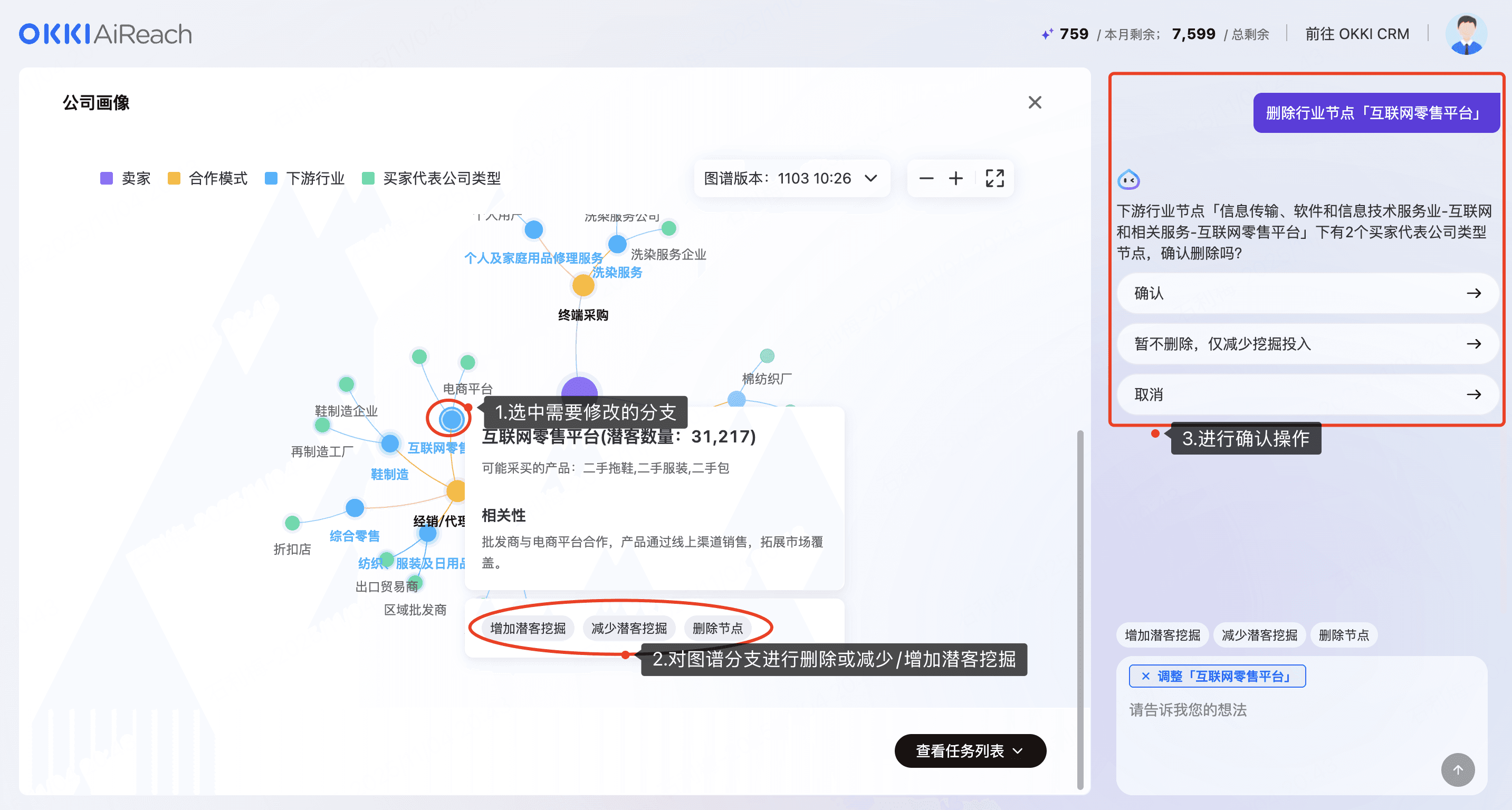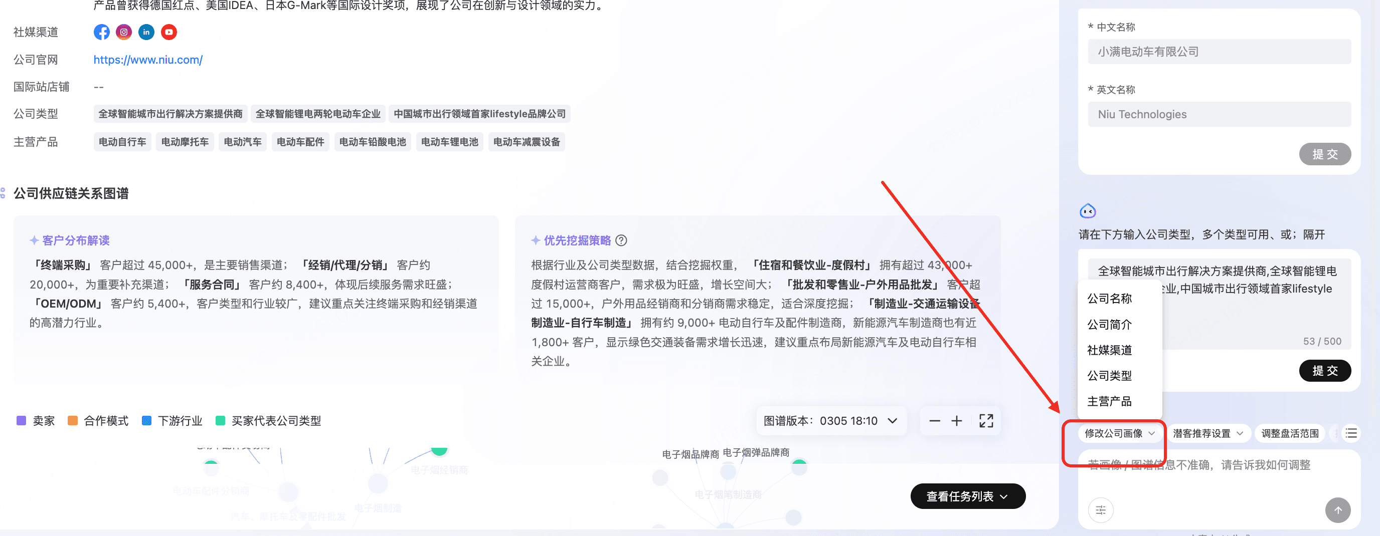 AI会根据网址及主营产品生成供应链图谱,商家确认图谱是否正确,正确可以进行下一步设置,如果有部分分支不对可以通过删除分支操作,也可以对某个分支进行增加或减少潜客挖掘