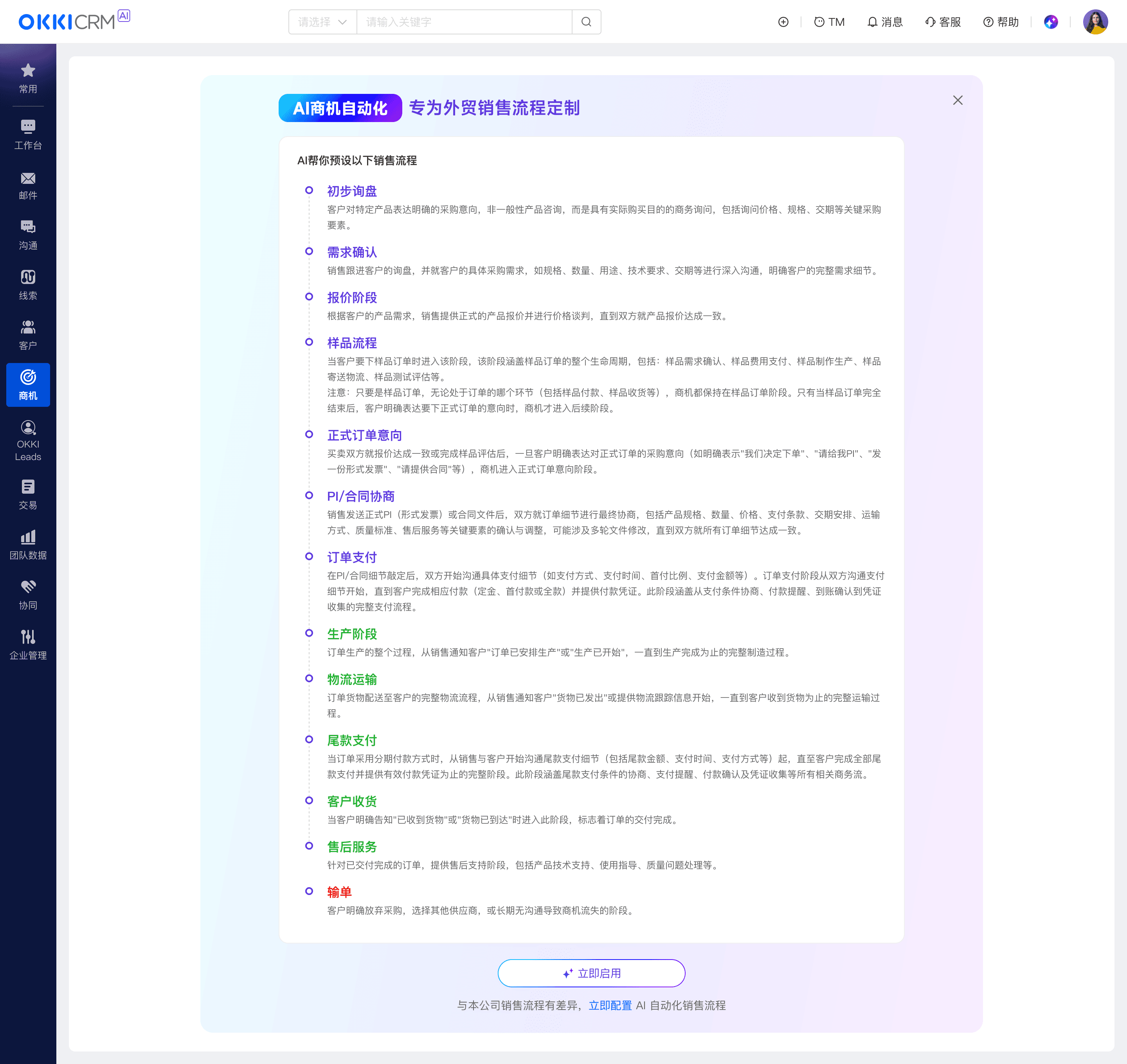 关注「AI重点跟进任务提醒」:系统会自动标识高意向客户并提示关键动作(如“客户已打开报价单3次,建议立即电话跟进”),避免错过最佳时机。