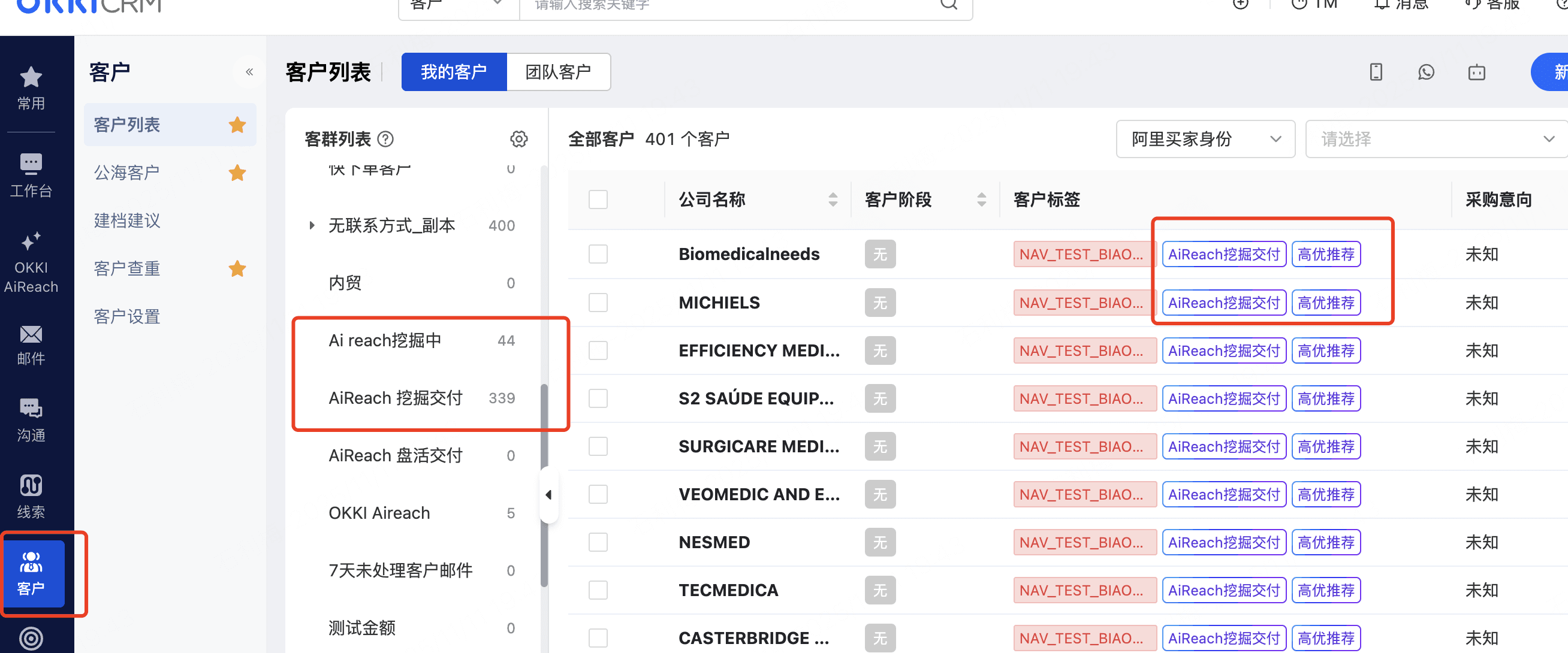 AiReach挖掘中客群:AI正在培育孵化中的潜在客户AiReach挖掘交付客群:已达商家设置交付标准的高意向客户(如前期设置「已打开」「已回复」等阶段)