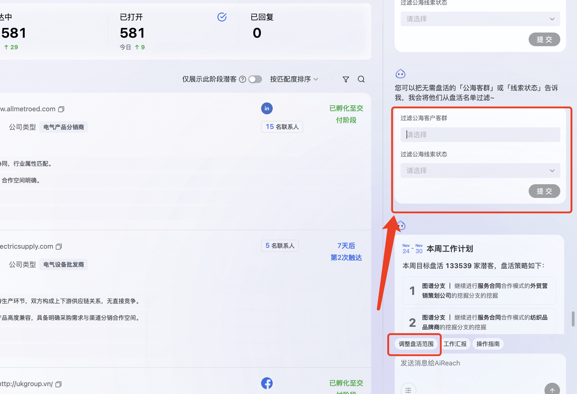 开启盘活前,先在CRM梳理客户池,发现很多商家,有些客户应该要进入公海,但是还在私海里面, 可以把需要盘活的客户移入公海进入AiReach进行定向盘活,同时可以把无需盘活的「公海客群」或「线索状态」告诉我,我会将他们从盘活名单过滤。