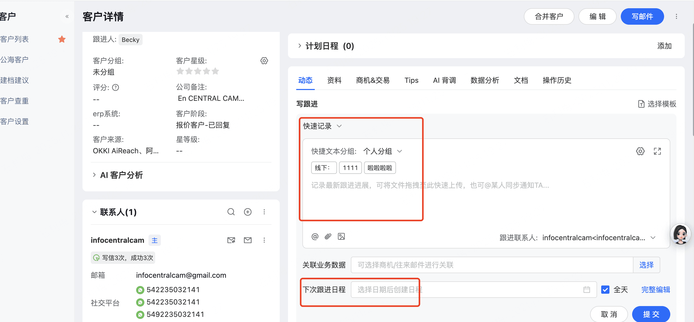 记录与标记:在CRM中快速记录沟通要点,标记客户阶段(如“需求确认”、“报价阶段”),并设置下次跟进提醒,形成培育闭环