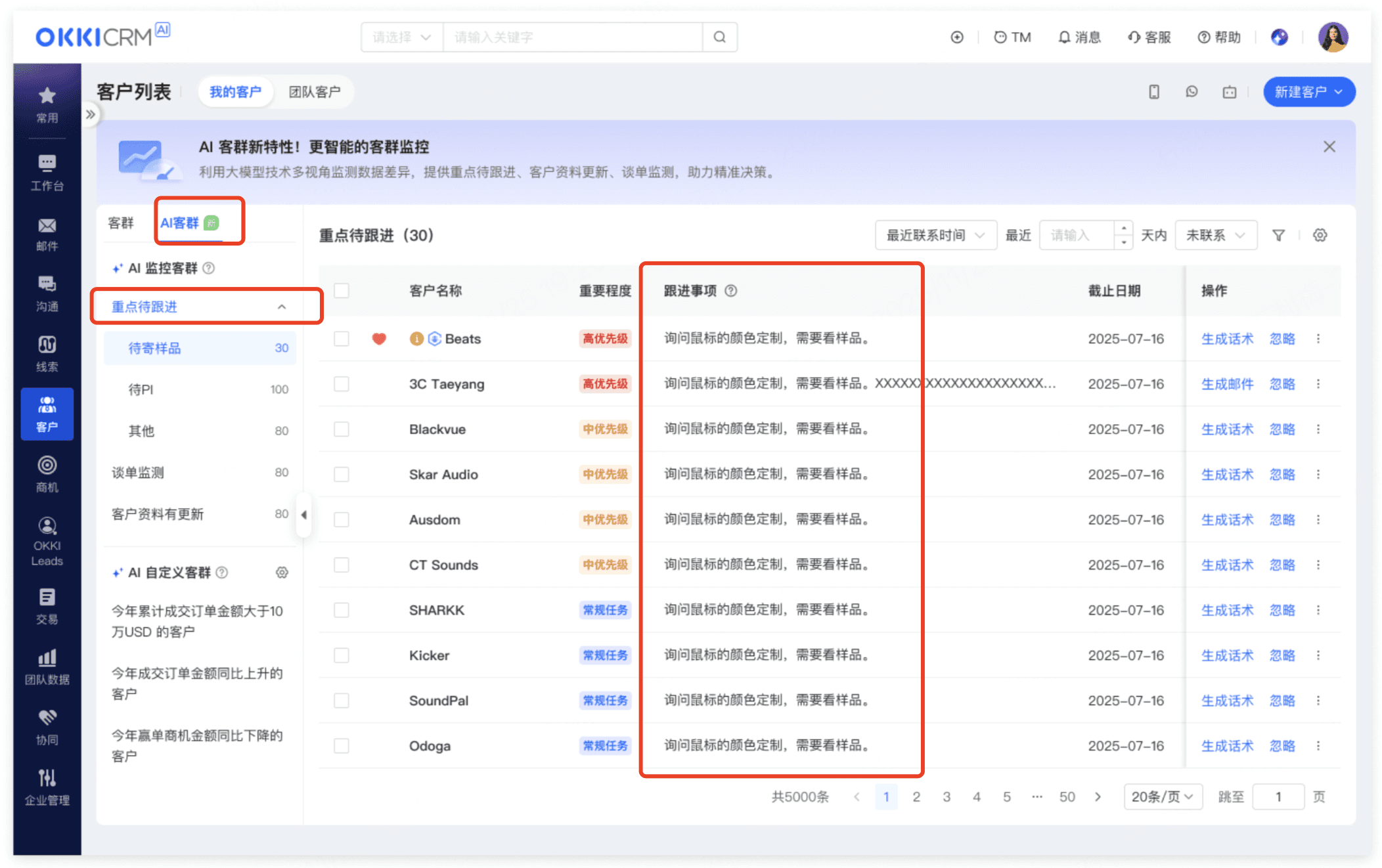 跟商机:重点关注有AI任务提醒的高意向客户,推动商机前进。