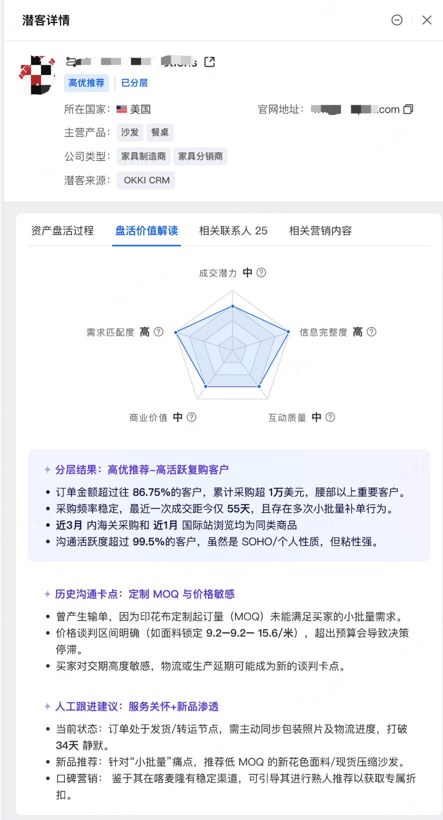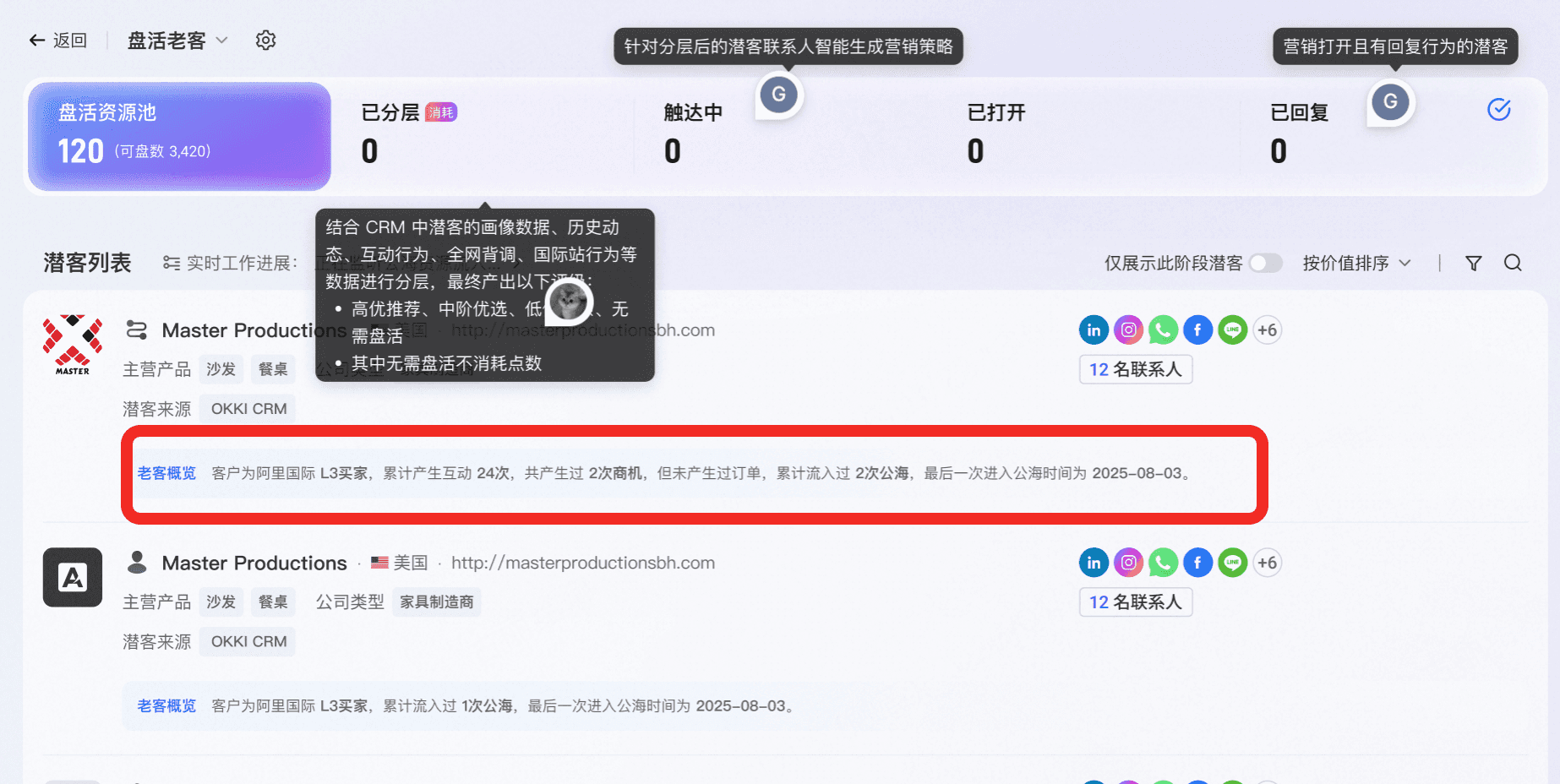 🔍盘活资源全息洞察:深度整合您CRM中的历史数据(聊天、订单、跟进记录),结合全网背调数据以及国际站浏览数据,实现客户价值的360°智能评估与洞察,为决策提供强大支持。