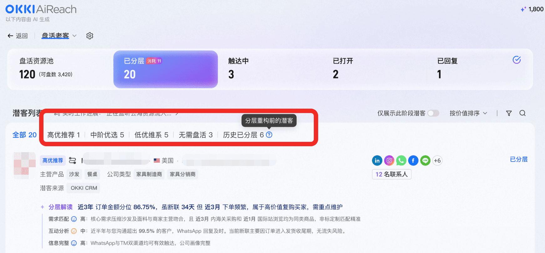 📊 新增客户分层:分层一眼即懂,引入全新 “五维价值雷达图” 与 “高优推荐、中优推荐、低优维系、无需盘活” 四个分层标签,客户价值与跟进优先级一目了然,并附带AI提炼的 “历史沟通卡点” 与 “跟进建议”