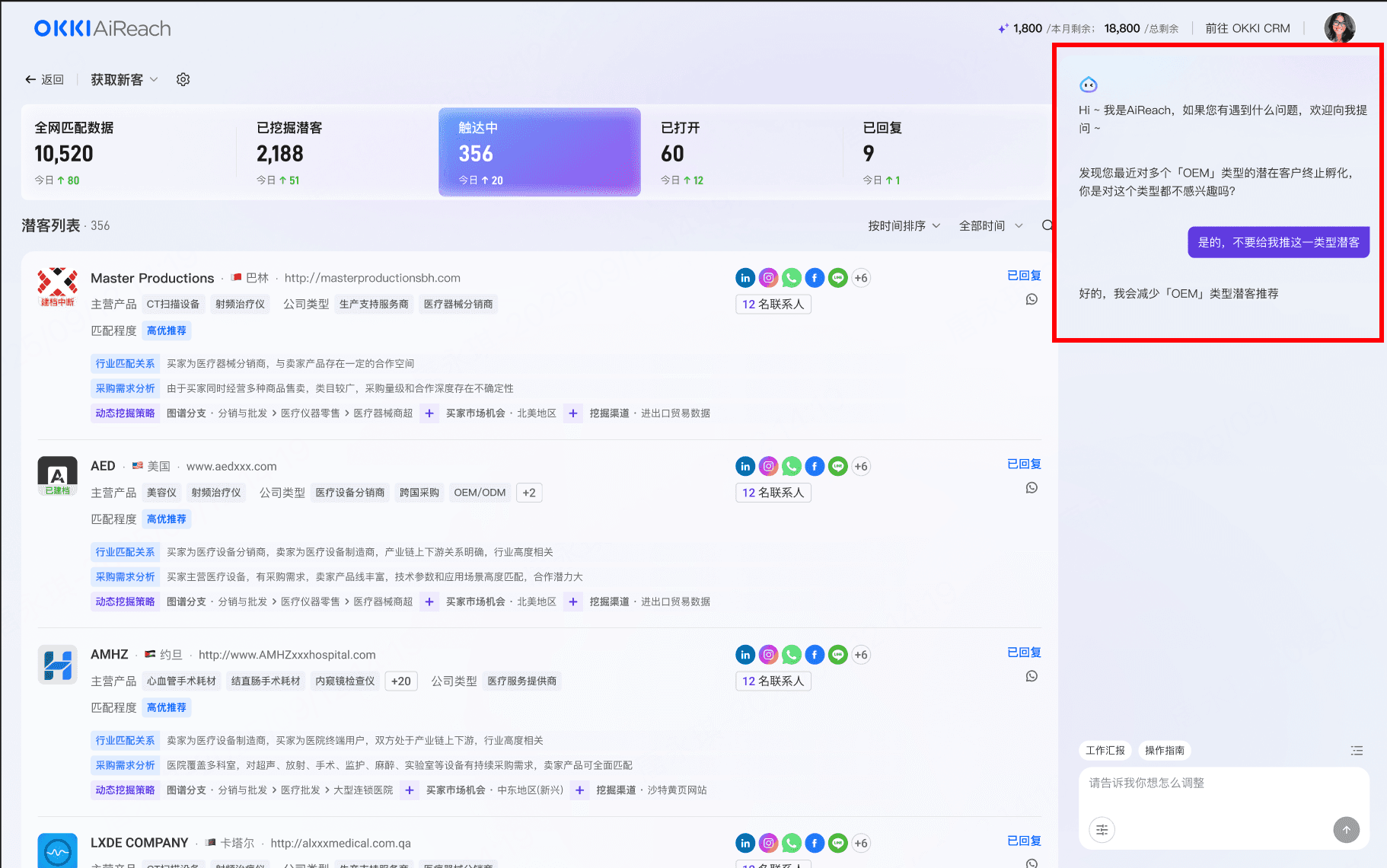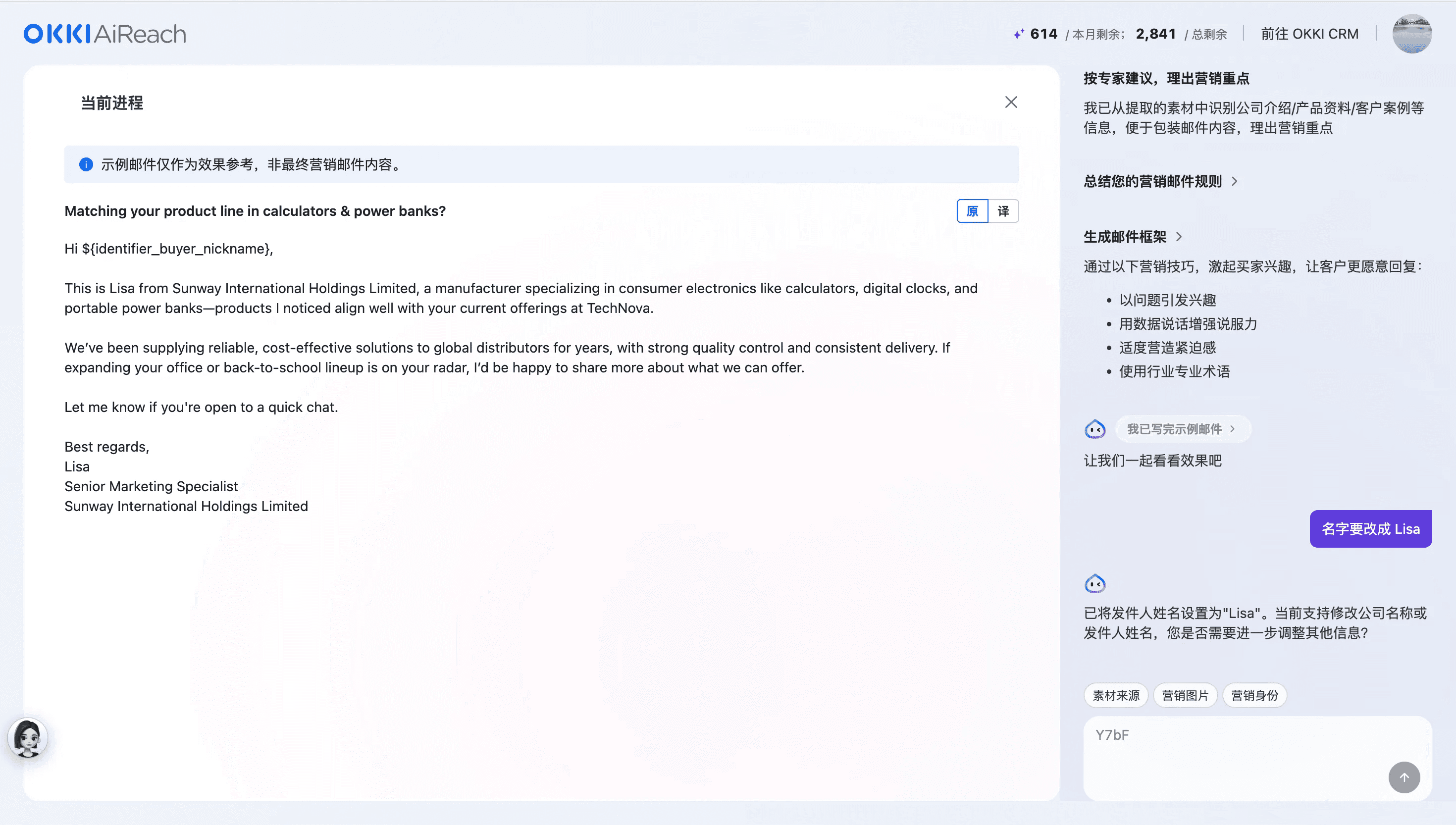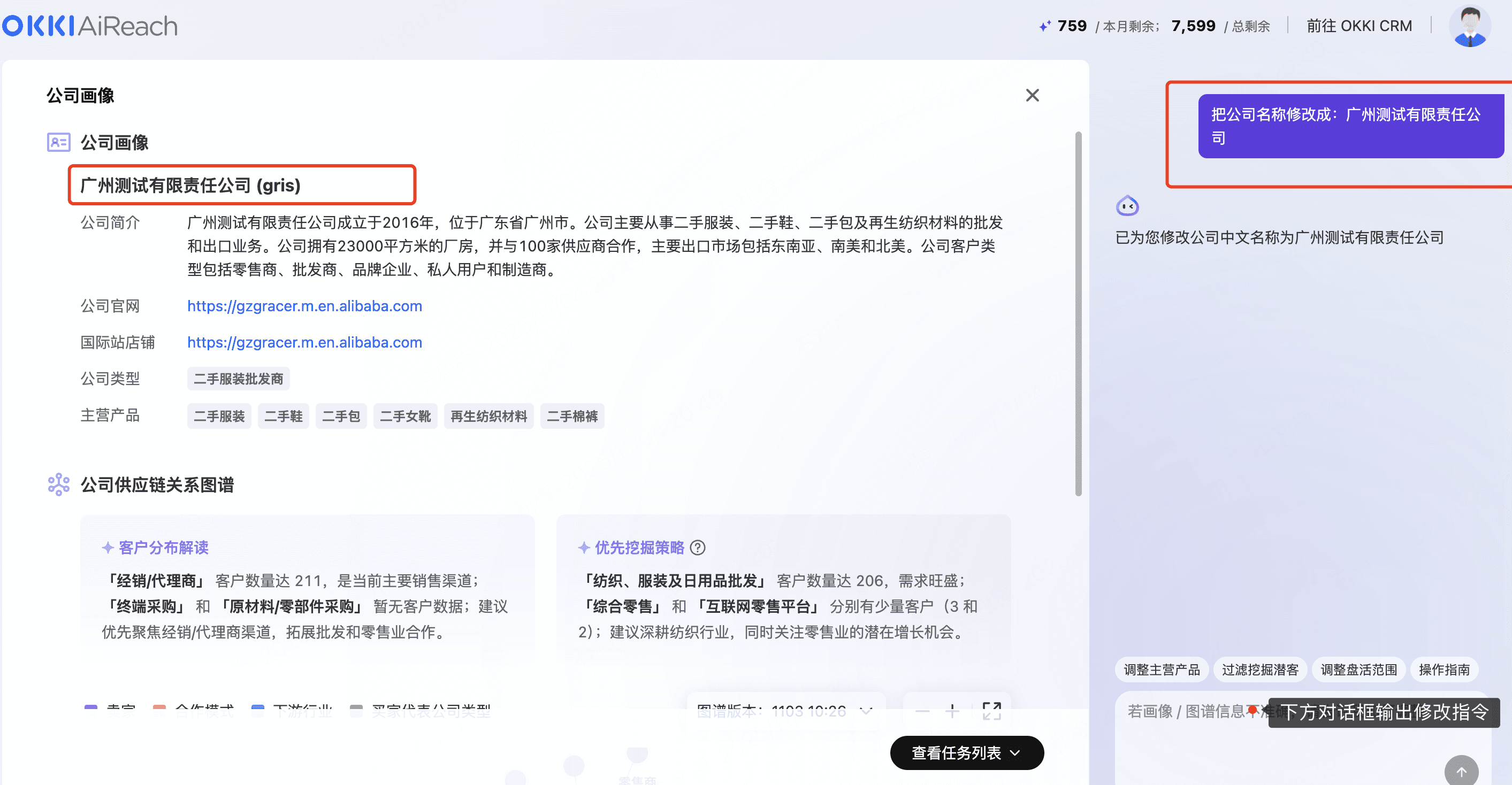 OKKI AiReach 会同时获取公司的中文、英文名称,则会同时展示两个名称(英文名称从网址解析获得,中文为音译名称)。若发现公司画像处的公司名错误,可通过对话方式修改公司名称。对话时,AiReach 将根据输入的语言来修改对应的中文名称/英文名称,英文名称修改后,营销策略处的英文公司名称也将同步更改。