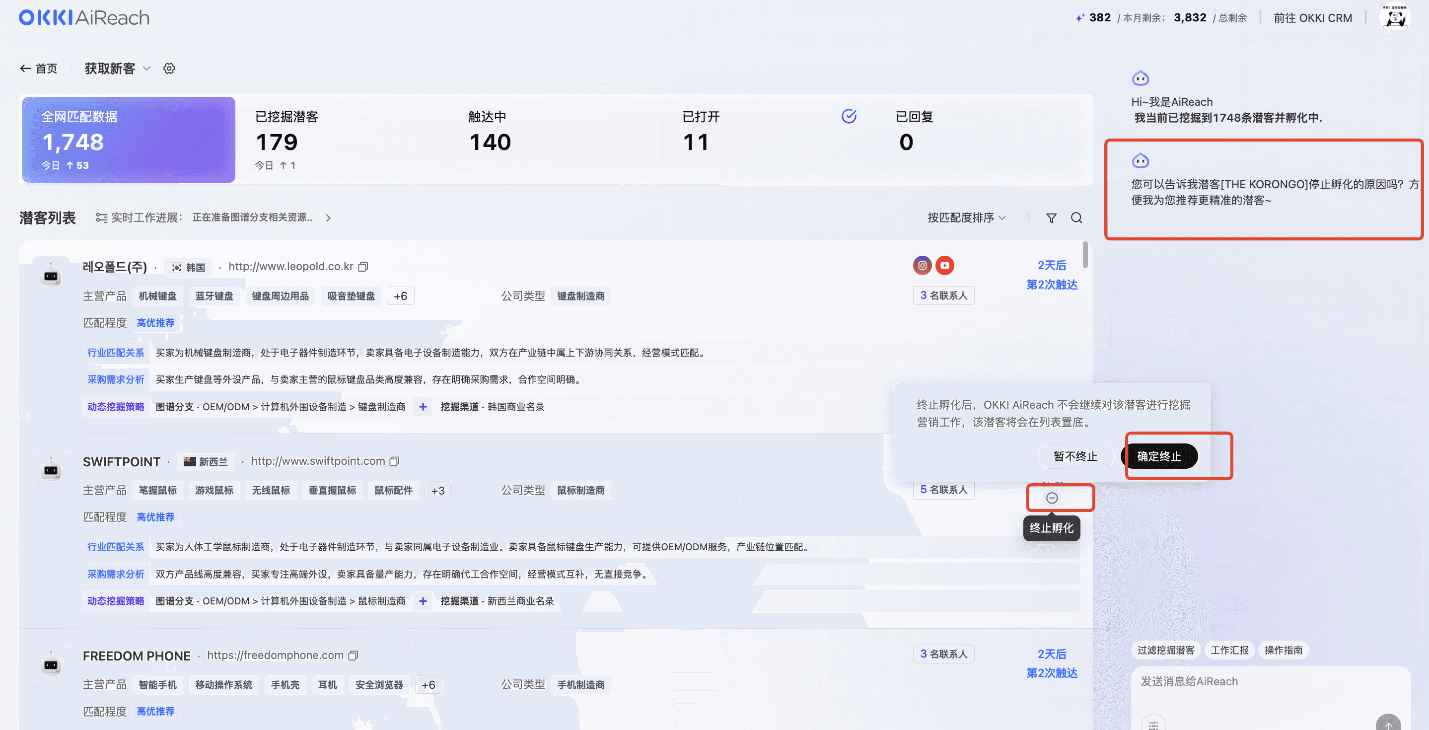 商家对某个潜客终止孵化时,将终止孵化的原因发送给AI,AI根据原因会进行不断优化调整,如是图谱的某一个分支的潜客都不匹配,会将这个分支的挖掘优先级降低。如果图谱正确,但是命中了某一个关键词的潜客不匹配,则会将具有这一特征关键词的推荐数据降低权重。