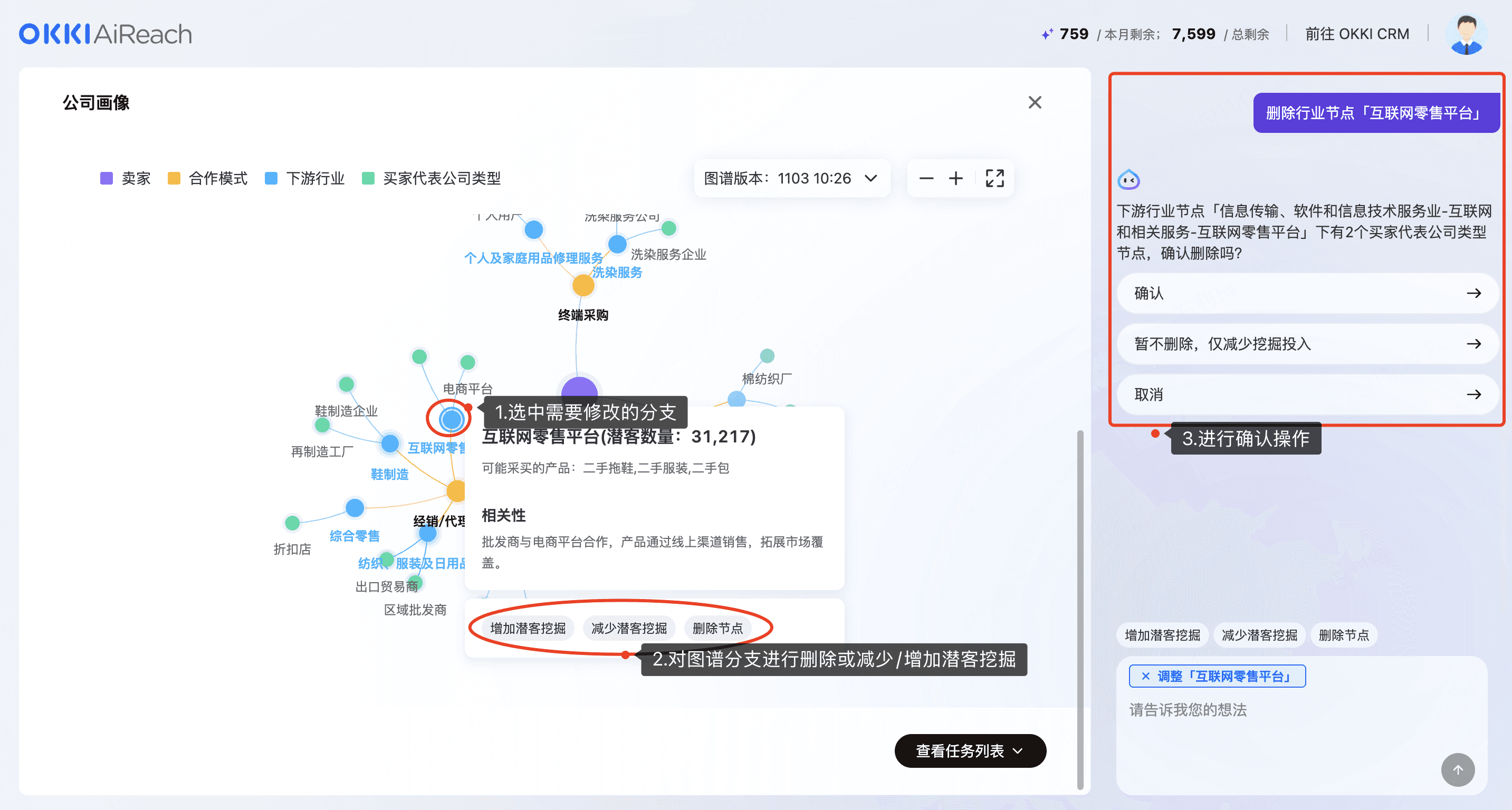 支持通过对话功能进行日常操作,如修改图谱、修改公司简介、调整营销策略等