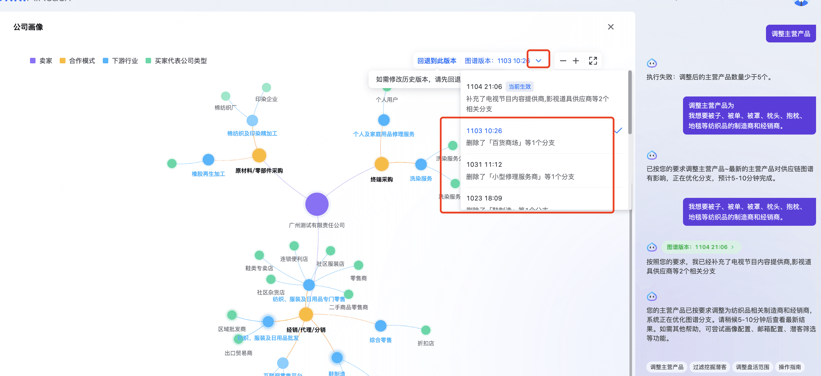 支持商家通过对话式适度修改图谱(包含增支/减支/加权/降权/重新生成及图谱版本管理)