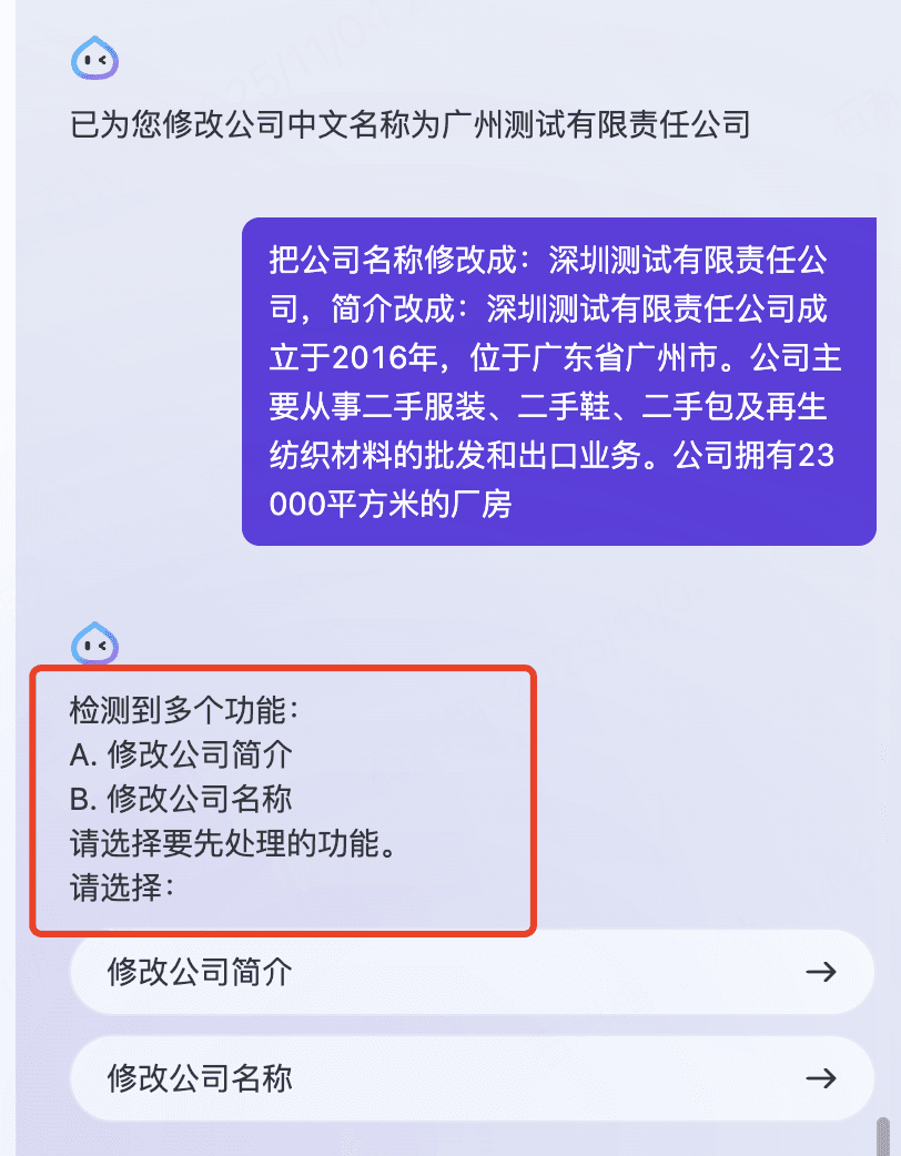 支持用户修改「公司名称」、「公司简介」、「公司类型」的对话式调整,通过下方对话框输入需要修改的信息:如把公司名称修改成xxx优先公司