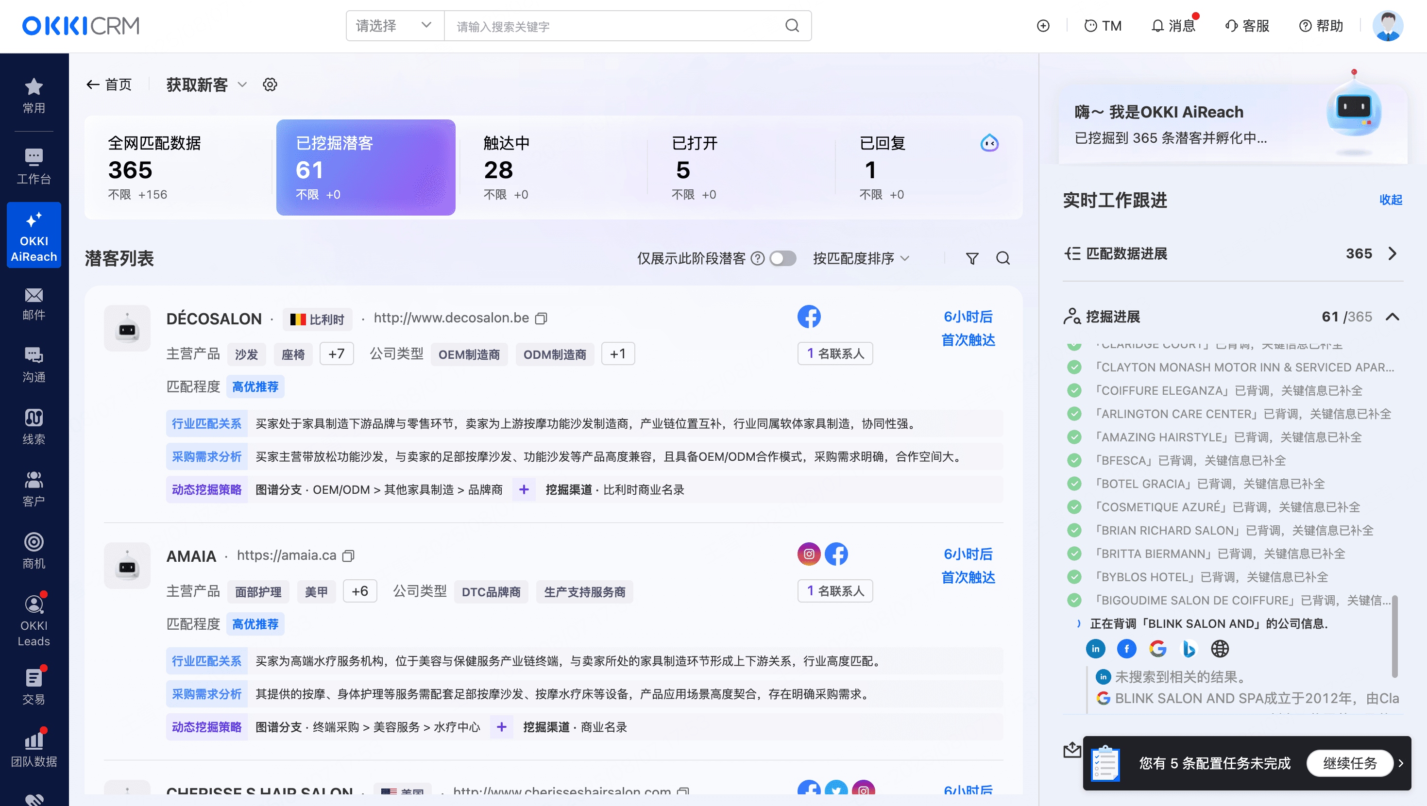 右侧动态面板展示 AiReach的工作进程动态,通过此处可以查看今日 AiReach在每个阶段已完成和进行中的工作,感知 AiReach 的工作量和工作进程。 若当前页面停留在第二阶段(已挖掘潜客/已背调),AiReach 每完成一个客户的背调,列表就会动态新增 1 个潜客哦~