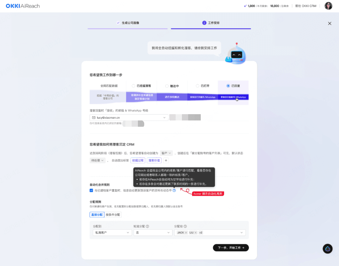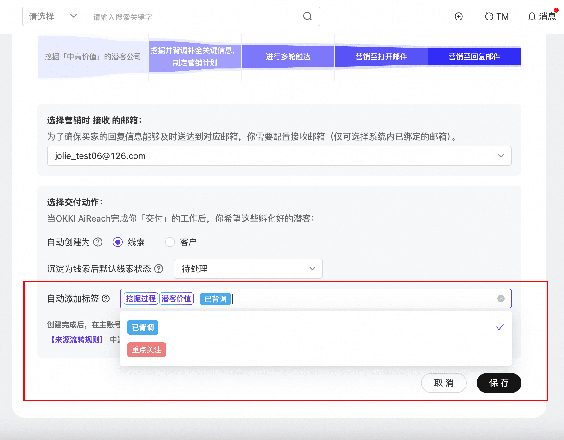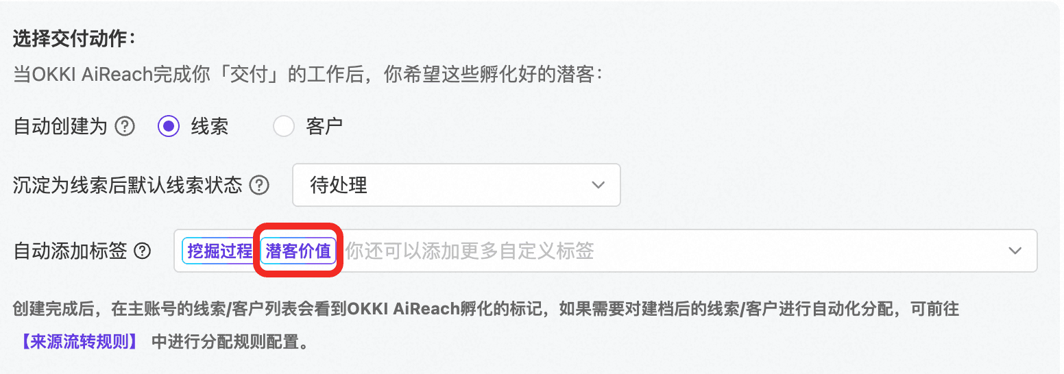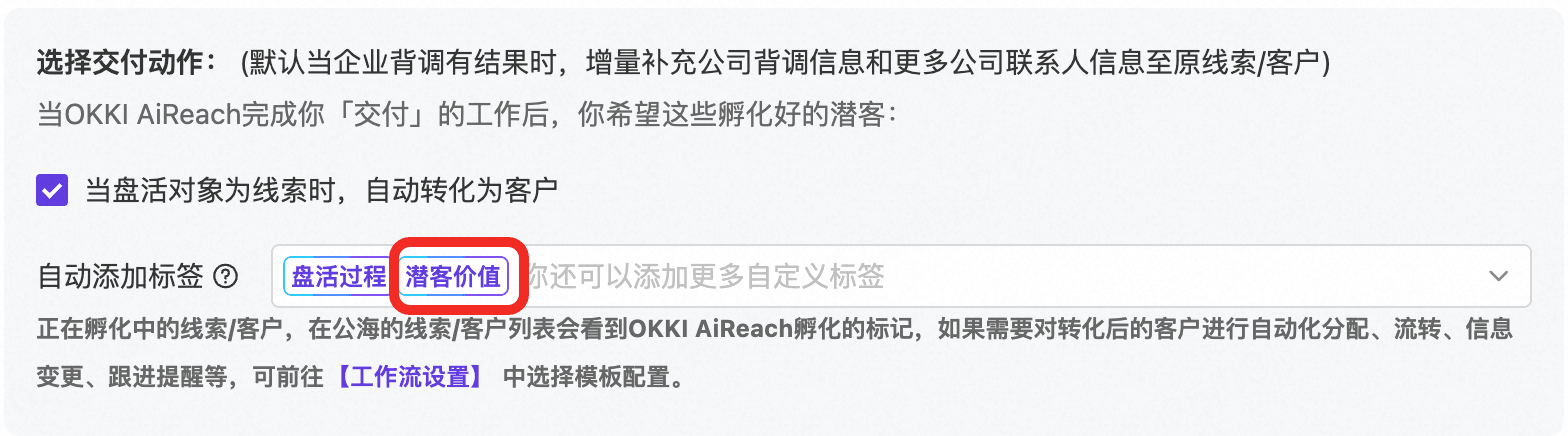 达到设置交付阶段时,会给潜客打标:OKKI AiReach 挖掘交付+潜客价值(高/中/弱) + 自定义标签。
