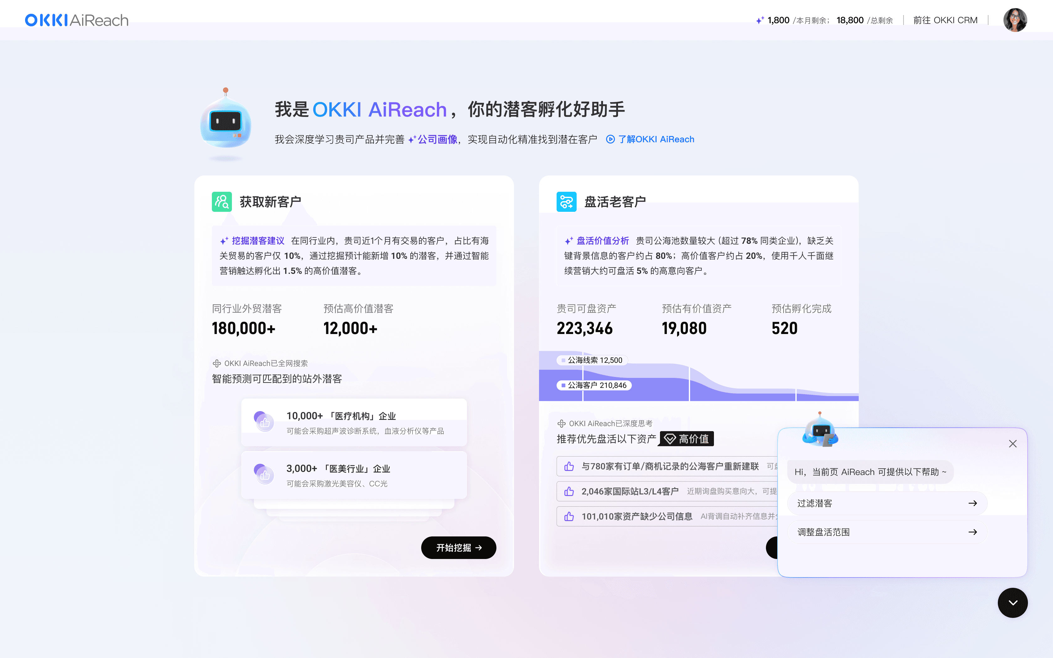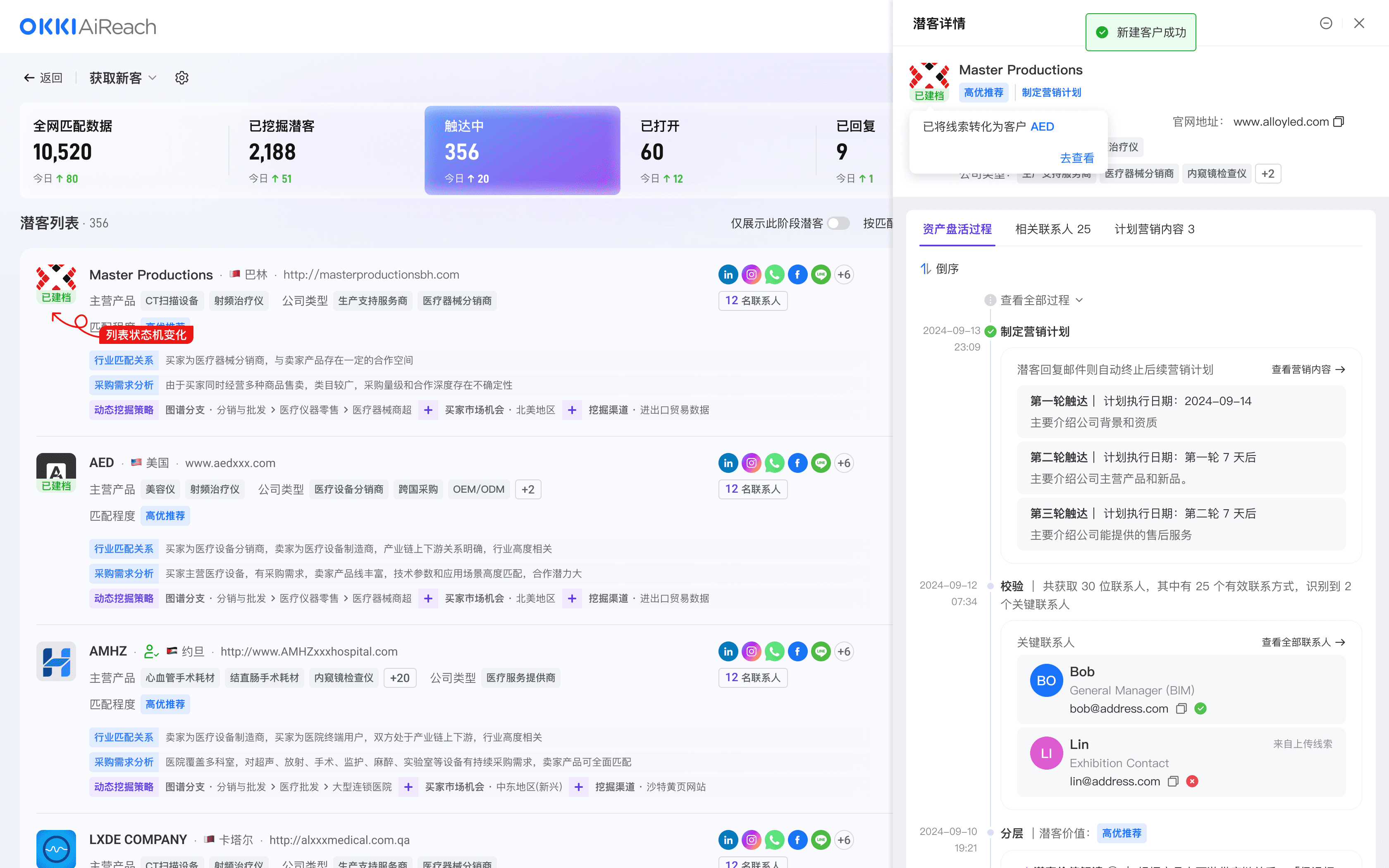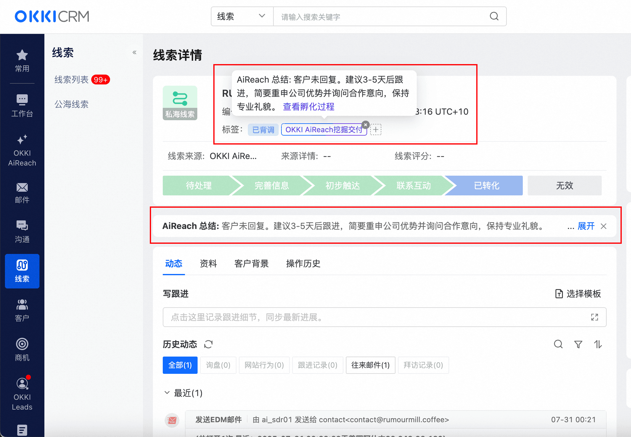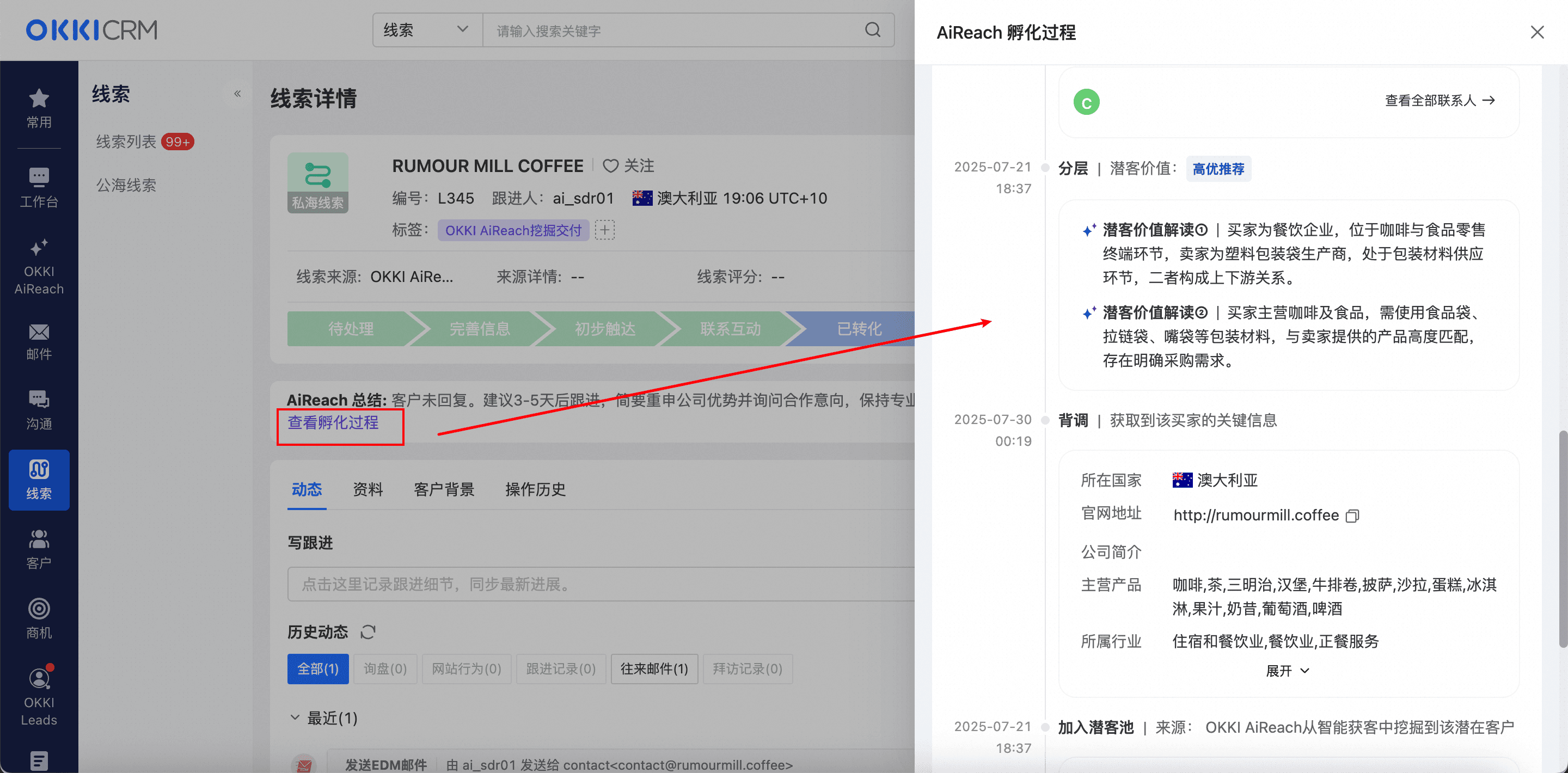 2. 🔥在CRM中新增 OKKI AiReach的两种客群,CRM客户/线索详情页新增 AiReach 孵化总结并可以查看孵化过程