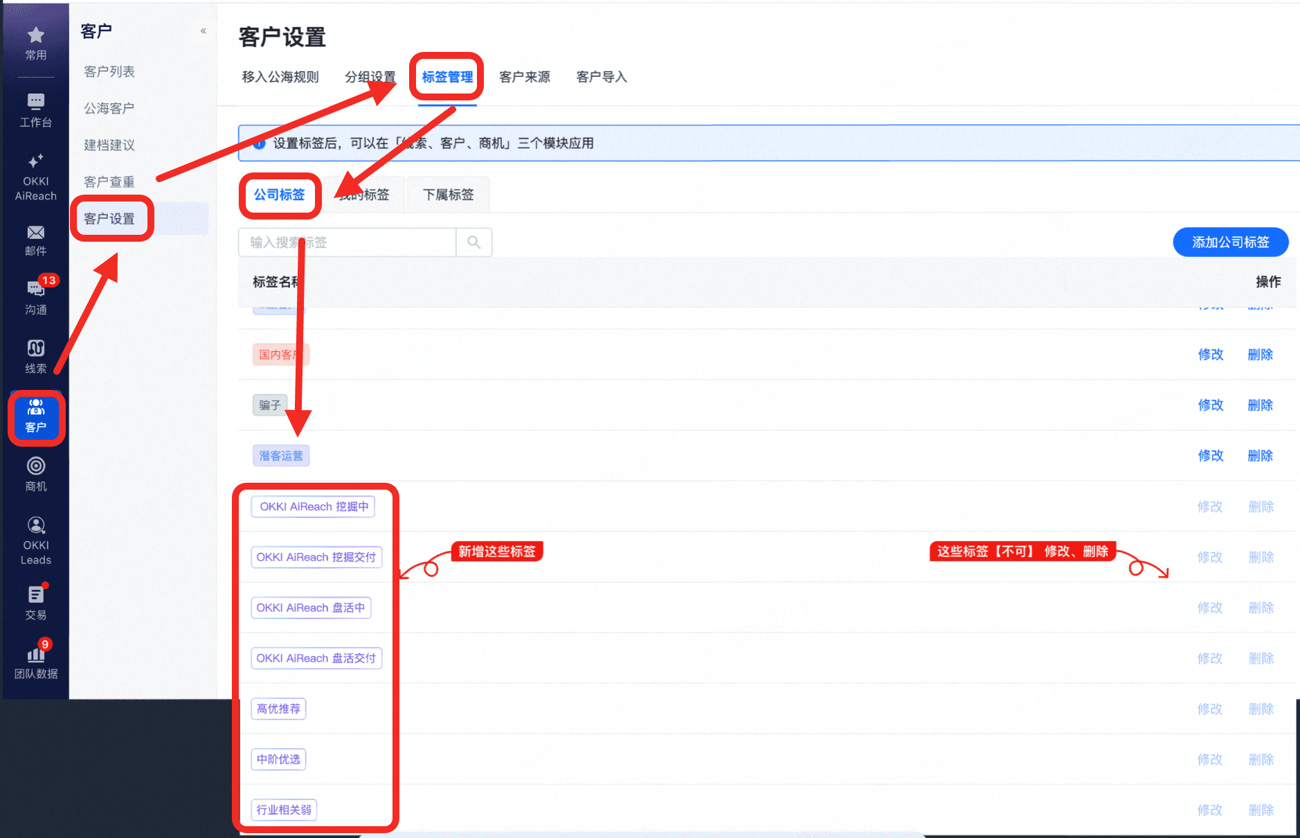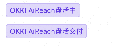 OKKI CRM的商家激活了OKKI AiReach后,CRM系统内会自动多出以下的标签(为了让商家在crm中能够快速知道AiReach正在跟进的潜客),且在使用AiReach过程中系统会识别潜客进度自动打对应标签,商家可以在crm侧看到具体的标签。