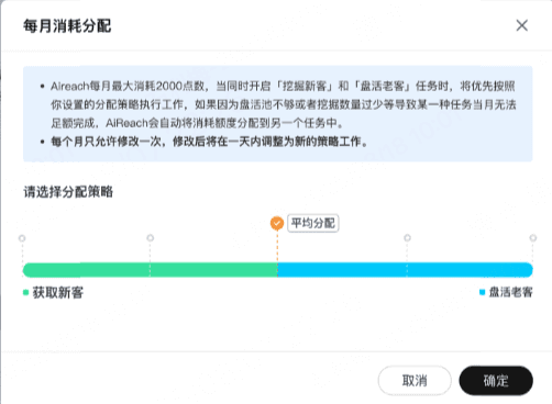 Aireach当同时开启「挖掘新客」和「盘活老客」任务时,将优先按照客户设置的分配策略执行工作,如果因为盘活池不够或者挖掘数量过少等导致某一种任务当月无法足额完成,AiReach会灵活进行消耗额度的分派。如果仅开始一种任务,AiReach不会自动打开另一个。