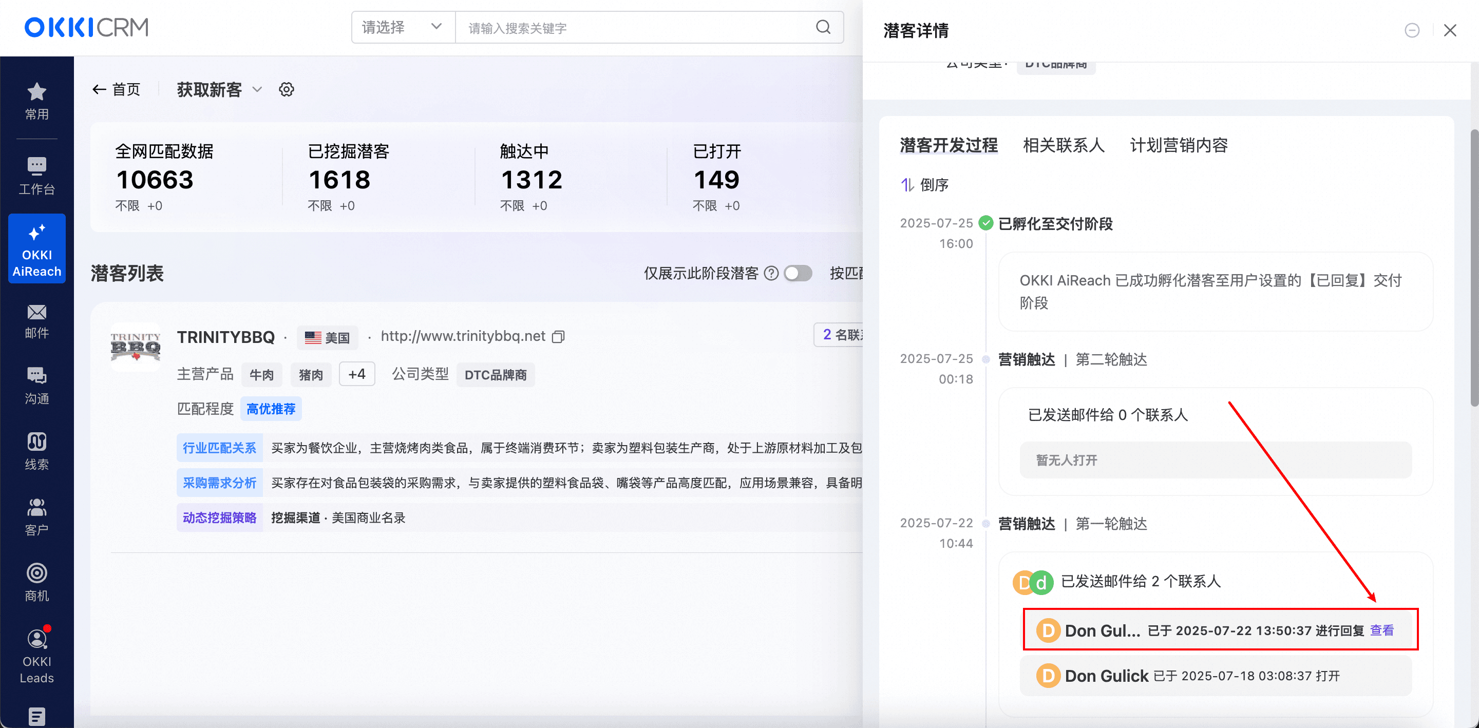 在OKKI AiReach潜客详情,可以直接查看潜客的回复内容,识别是否为有效回复。点击“查看”会展开抽屉页即可