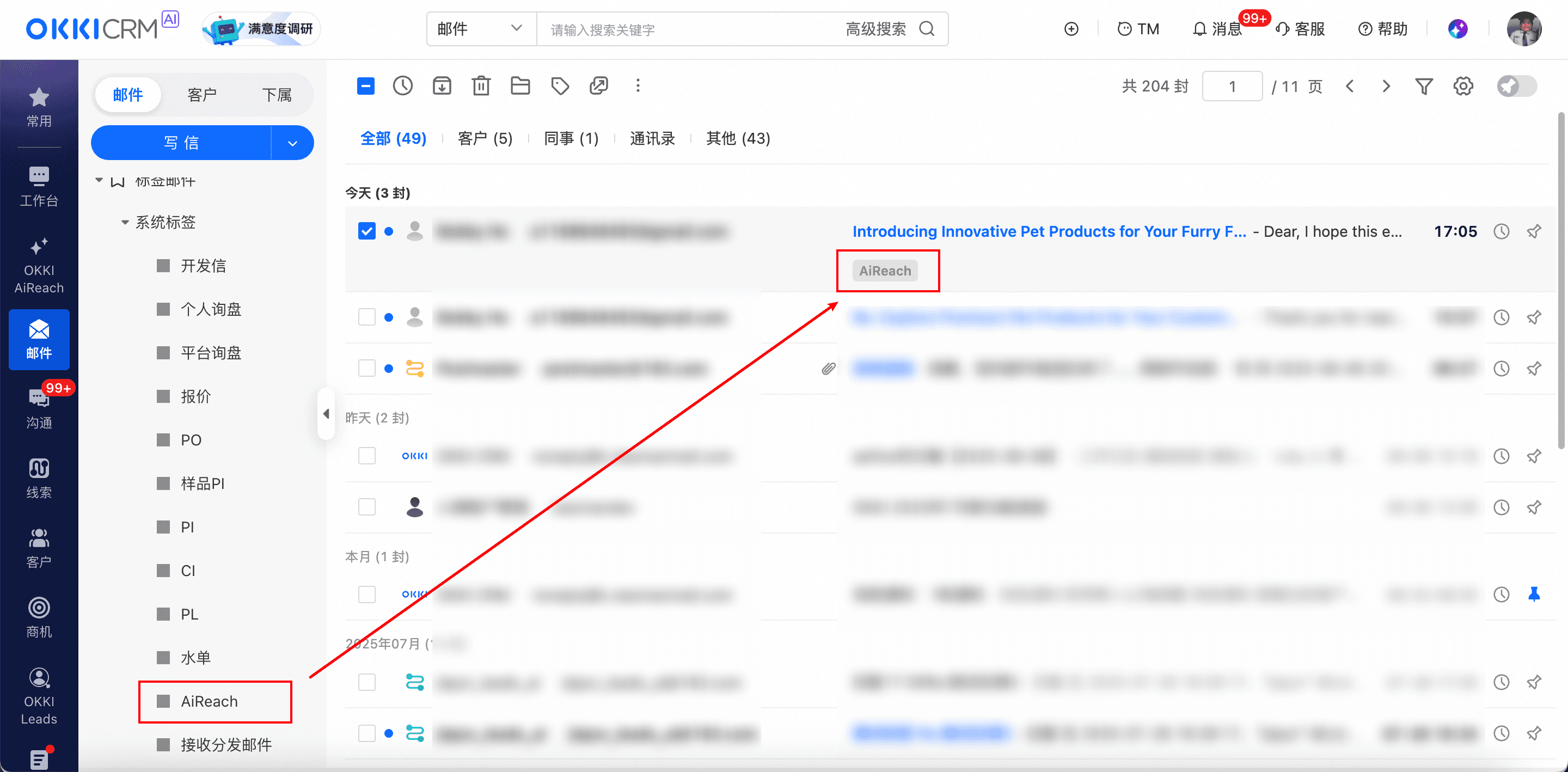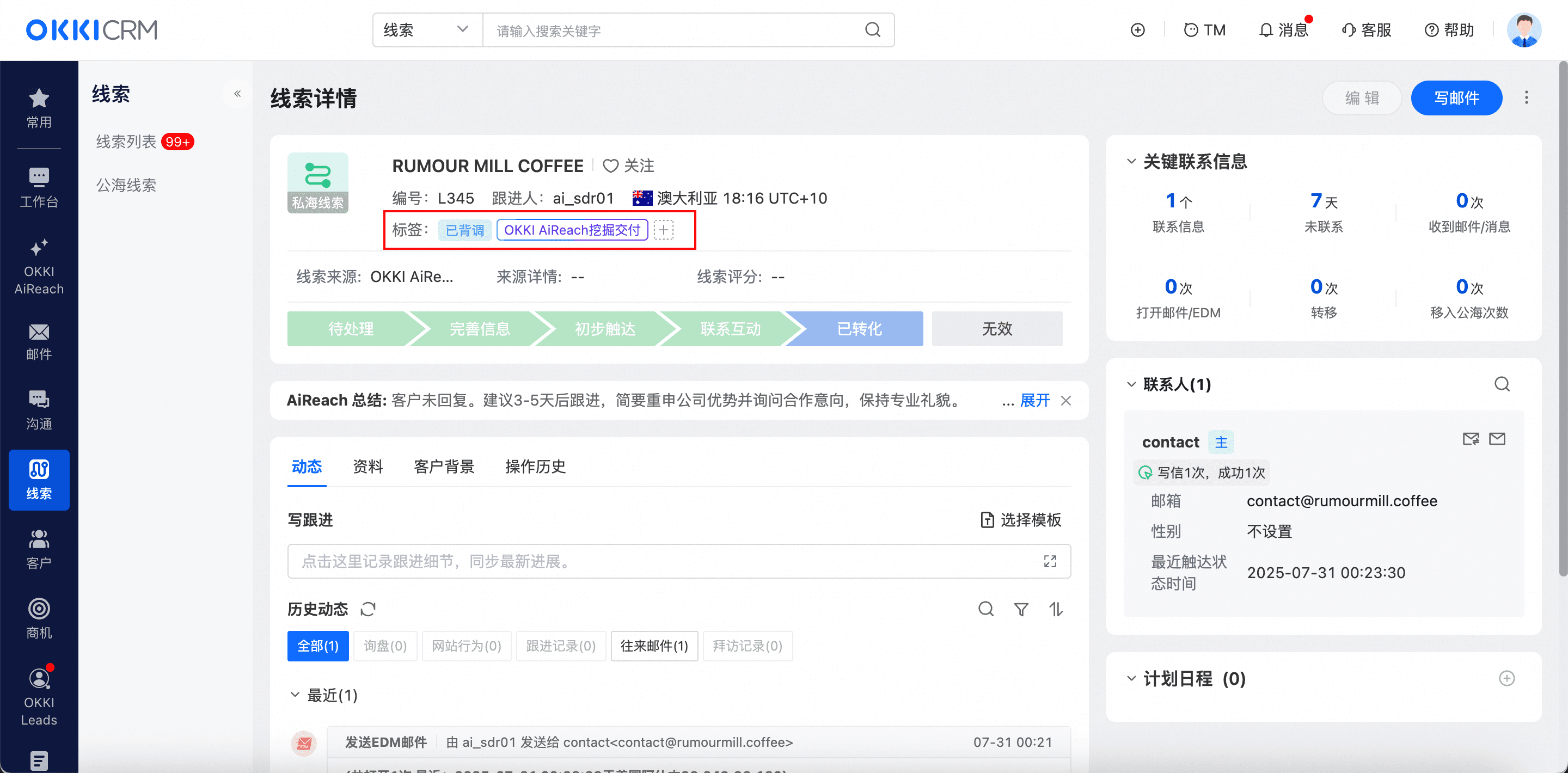 潜客回复 AiReach EDM,在crm系统中回信自动打标「AiReach」,用户可以按标签一键筛选