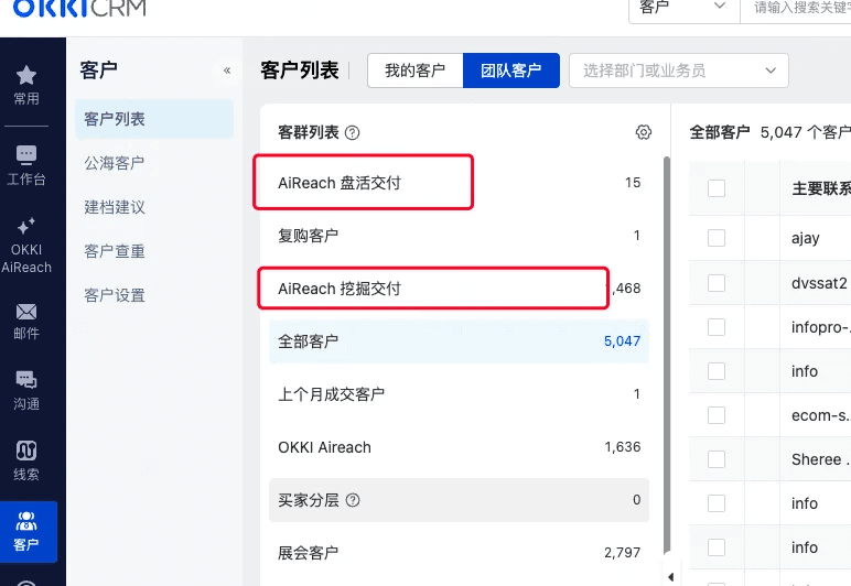 客群:系统后台默认在 AiReach 中新客挖掘、老客盘活为交付成功时,在客户模块会自动创建 “AiReach 挖掘交付”、“AiReach 盘活交付”的客群,用户点击可以筛选出所有通过 AiReach 挖掘/盘活并交付了的潜客。