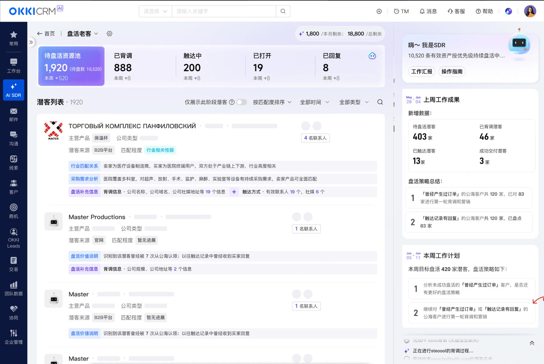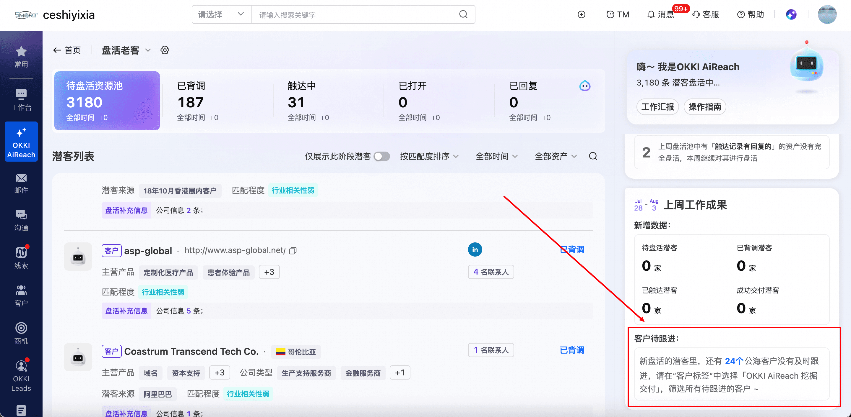 进入待盘活资源池时,会给潜客打标:OKKI AiReach 盘活中+潜客价值(高/中/弱) + 自定义标签。