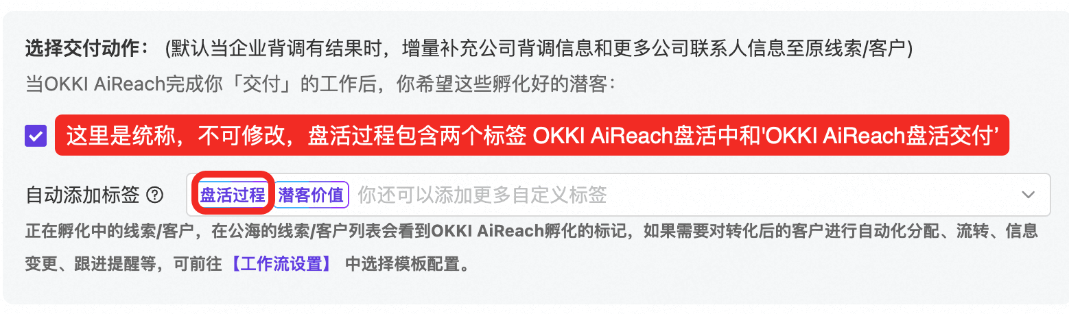 【盘活过程】此标签为统称,会按照潜客盘活的进展,在CRM中自动识别打标签‘OKKI AiReach盘活中’或者‘OKKI AiReach盘活交付’,如果潜客从盘活中变为交付成功,标签也会自动变化。