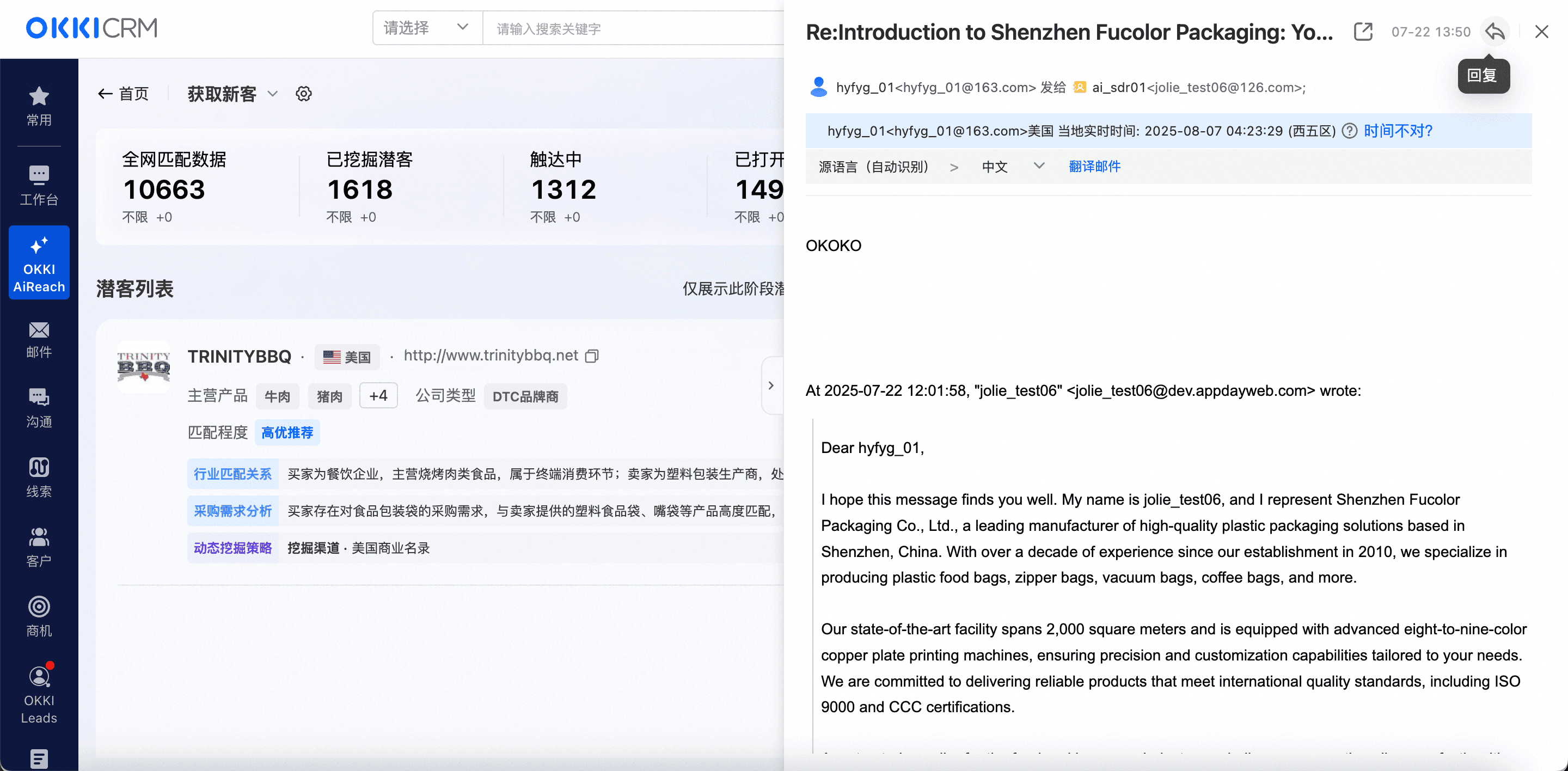 3. 在 OKKI AiReach中的 EDM 回信可在两个系统中分别查看